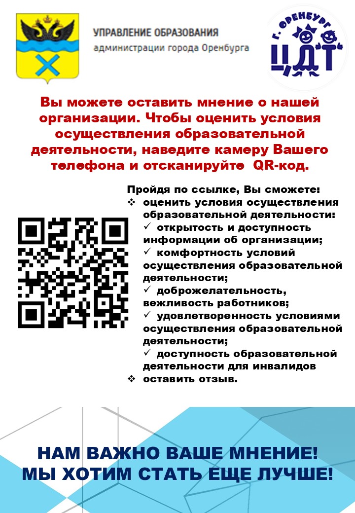 Независимая оценка качества образования МАУДО ЦДТ г. ОренбургаУважаемые родители! Вы можете оставить мнение о нашей организации. Чтобы оценить условия осуществления образовательной деятельности, наведите камеру Вашего телефона и отсканируйте QR-код. НАМ ВАЖНО ВАШЕ МНЕНИЕ! МЫ ХОТИМ СТАТЬ ЕЩЕ ЛУЧШЕ! Ссылка на опрос https://bus.gov.ru/qrcode/rate/381618 |